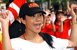 香港麥當勞4日在銅羅灣時代廣場舉行早餐誓師大會﹐呼吁香港人身體力行﹐踏上健康路﹐每天步行一萬步﹐影星林嘉欣出席﹐并與眾人一起﹐步行100步﹐踏上健康路。作者:趙振清