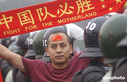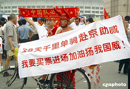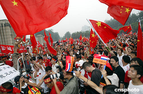 8月7日晚八時,2004年亞洲杯足球賽決賽中國隊與日本隊的比賽將在北京工人體育場舉行,各地球迷提前到達北京工人體育場為中國隊加油。圖為北京工人體育場外為中國隊加油的球迷。