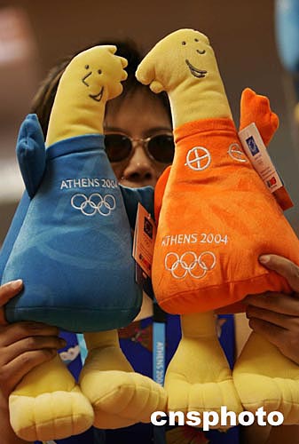 (當地時間)二○○四年八月八日,雅典奧運吉祥物“雅典娜”和“費沃斯”吸引前來采訪的記者。據悉,這種精致可愛的卡通絨毛玩具由中國制造,價格由二點五歐元至十幾歐元不等。中新社記者:毛建軍