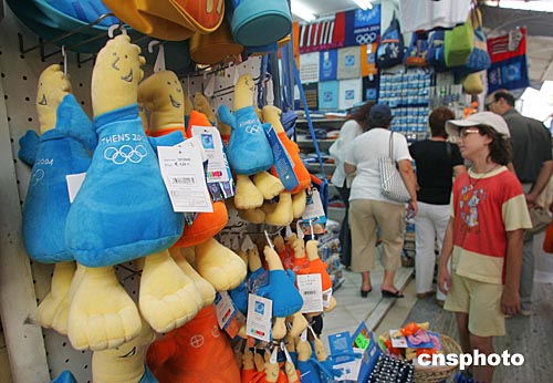 雅典奧運會開幕在即,雅典街頭的旅游商店正在熱銷奧運會的吉祥物毛絨玩具。這些毛絨玩具的產地是中國。中新社記者:張煒