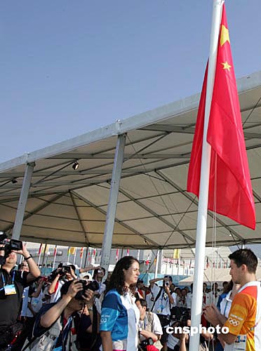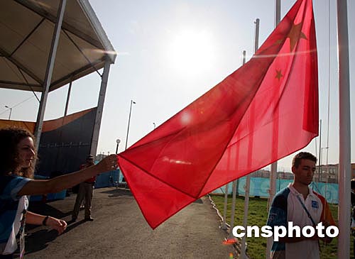 鮮艷的五星紅旗在奧運村升起。