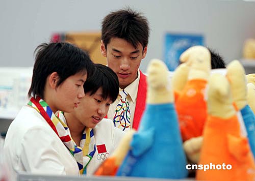 當地時間八月九日上午,參加雅典奧運會的中國代表團女子游泳小將江文菁(中)等利用賽前閑暇時間,在奧運選手村逛商店,在琳瑯滿目的奧運吉祥物紀念品前駐足留連。中新社記者:毛建軍