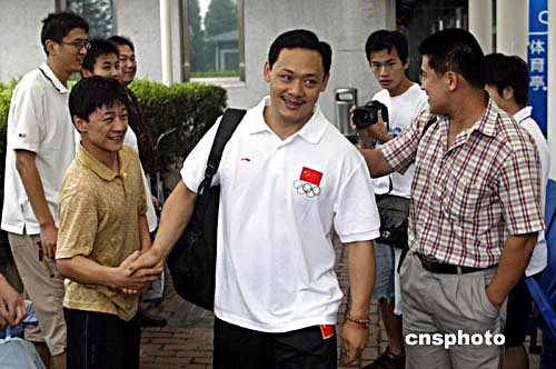八月十二日,中國舉重隊著名選手占旭剛(中)在中國國家體育總局訓練局與隊友們告別奔赴雅典,這是中國舉重隊第二批隊員出征雅典奧運會。中新社記者:盛佳鵬