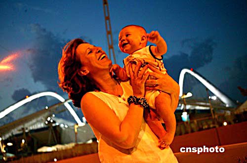 在雅典醫(yī)院工作的護(hù)士撒拉瑪抱著三個(gè)月大的兒子在奧運(yùn)會(huì)主賽場(chǎng)前歡迎離開雅典108年的奧運(yùn)回家,她說孩子六個(gè)月大時(shí)才能起名字,他該有個(gè)與奧運(yùn)有關(guān)的名字作紀(jì)念。中新社記者:王瑤