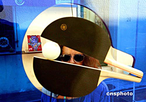 奧運開幕前,在雅典市中心的奧運主題一條街上,一名游客正仔細觀看作為藝術品陳列的乒乓球拍。中新社記者:王瑤
