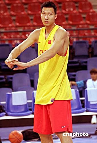 將要在開幕式上擔任中國代表團旗手的姚明在訓練中與主教練交流。