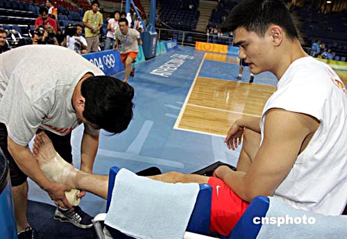 圖為將要在開幕式上擔任中國奧運代表團旗手的姚明(右)在訓練前接受隊醫對其進行包裹保護。