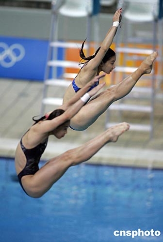 雅典奧運開賽首日(14日)將產生兩枚跳水金牌。郭晶晶與吳敏霞是女子三米板雙人金牌的最大熱門。目前,郭晶晶和吳敏霞正在進行緊張的賽前訓練。中新社記者:毛建軍
