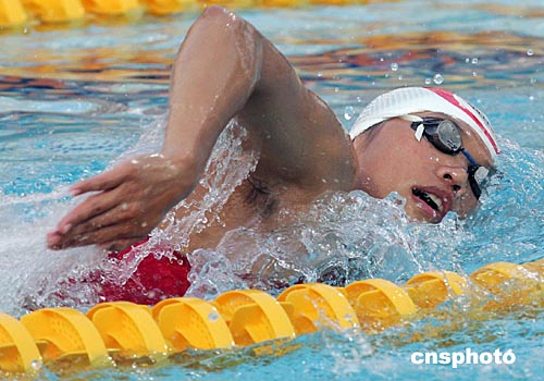 中國游泳名將齊暉當地時間八月十二日晚在雅典奧運賽場進行熱身訓練。中新社記者:毛建軍