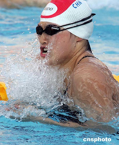 中國游泳名將羅雪娟當?shù)貢r間八月十二日下午在雅典奧運賽場進行賽前訓練。中新社記者:毛建軍