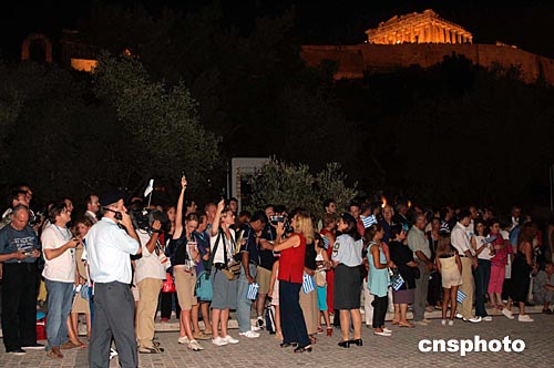 當地時間8月12日傍晚,奧運火炬即將到達雅典衛城,市民夾道迎接圣火到來。中新社記者:張煒