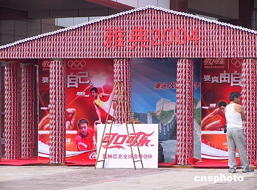 當(dāng)運(yùn)動(dòng)健兒和各家媒體都在為奧運(yùn)會(huì)做最后的準(zhǔn)備時(shí),許多商家也瞄準(zhǔn)了雅典奧運(yùn)巨大的商機(jī)。八月十三日在北京西單,一家公司正打著雅典奧運(yùn)的旗號(hào)為自己的商品做促銷準(zhǔn)備。作者:任振興