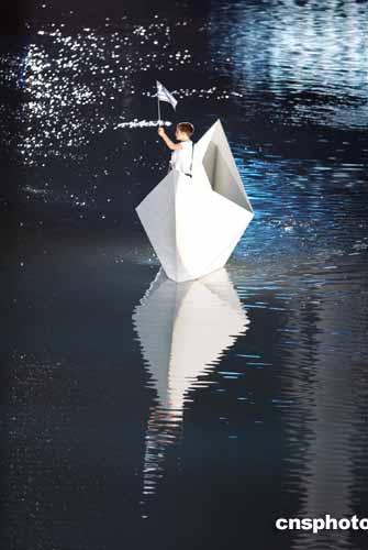 圖:奧運(yùn)開(kāi)幕表演 水中乘紙船的兒童