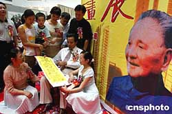 著名書畫家朱繼峰創(chuàng)作的巨法書法作品《東方巨龍》,八月十四日在深圳舉辦的紀(jì)念鄧小平誕辰一百周年書畫展上出展,這幅用九百九十九個“壽”字組成的作品,一九九四年被鄧小平家人收藏。中新社記者:宋吉河