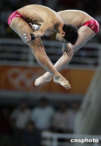 當地時間八月十四日晚,中國跳水隊田亮、楊景輝在雅典奧運跳水館獲得男子雙人十米跳臺金牌。中新社記者:毛建軍