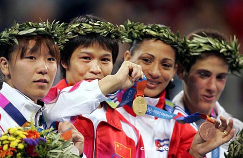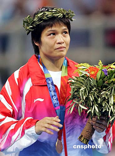 當?shù)貢r間八月十五日,在雅典舉行的第二十八屆奧運會女子五十二公斤級比賽中,中國選手冼東妹戰(zhàn)勝日本選手橫澤由貴獲得金牌。中新社記者:毛建軍