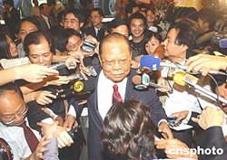 曾憲梓出席在香港商報(bào)舉行的紀(jì)念鄧小平100周年誕辰圖片展﹐被到場(chǎng)的記者團(tuán)團(tuán)圍住。