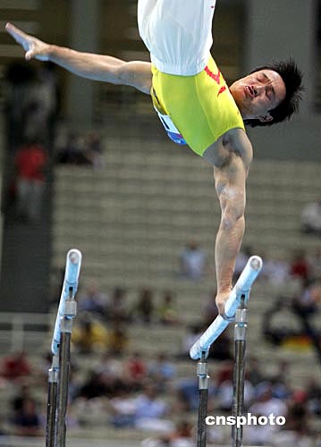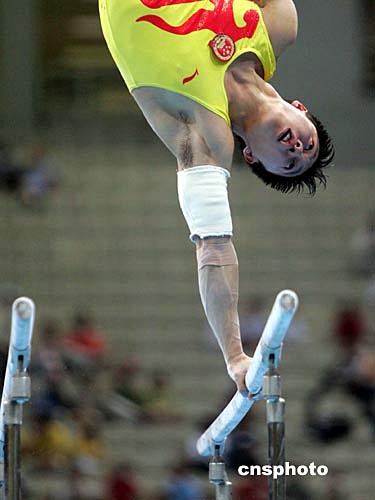 圖為李小鵬在雙杠比賽中表現出色,顯示出個人能力。