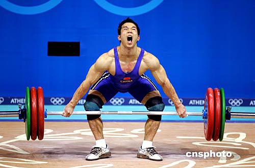 雅典當地時間二00四年八月十六日,雅典奧運會男子舉重六十二公斤級比賽在雅典尼凱亞奧林匹克舉重館舉行,中國選手石智勇和樂茂盛包攬金銀牌。作者:新體
