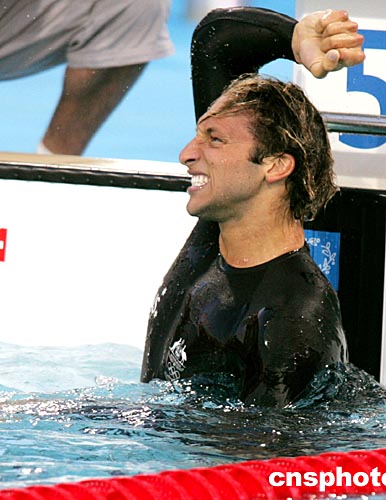 澳大利亞飛魚索普第一個(gè)抵達(dá)終點(diǎn)時(shí)興奮地?fù)]臂慶祝自己的勝利