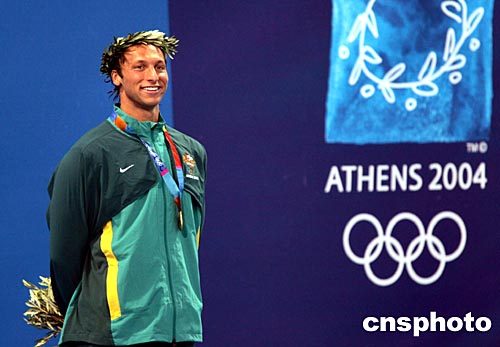 幾乎與第二十八屆奧運(yùn)會(huì)絕緣的澳大利亞飛魚索普,當(dāng)?shù)貢r(shí)間8月16日晚在雅典奧運(yùn)會(huì)男子100米自由決賽中獲得冠軍,再次登上冠軍領(lǐng)獎(jiǎng)臺(tái)。中新社記者:任晨鳴