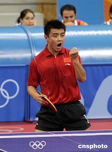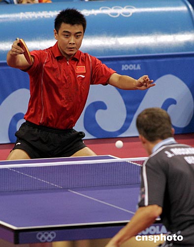 雅典當地時間8月17日,首次參加奧運會的中國乒乓小將王皓以4比1打敗德國老將羅斯科夫,晉級男單第四輪。中新社記者:張煒