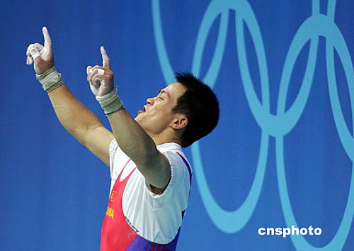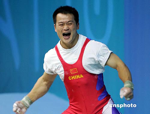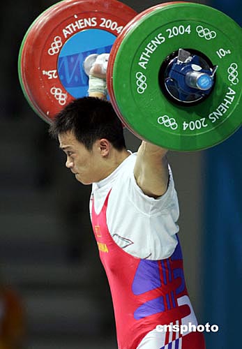 希臘當地時間八月十八日晚,中國舉重選手張國政在雅典奧運男子六十九公斤級舉重比賽中,以三百四十七點五公斤的總成績獲得冠軍,為中國代表團“舉起”第十一枚金牌。作者:毛建軍