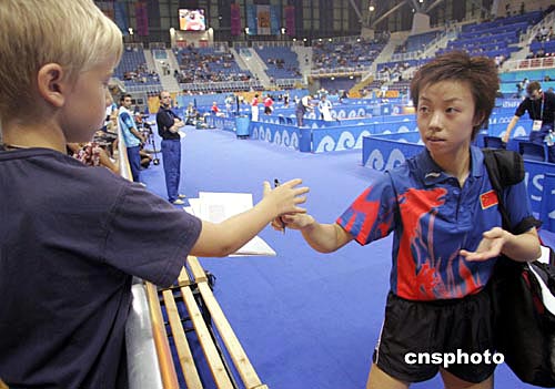 圖為希臘小球迷向張怡寧索要簽名。