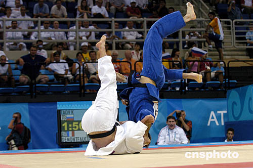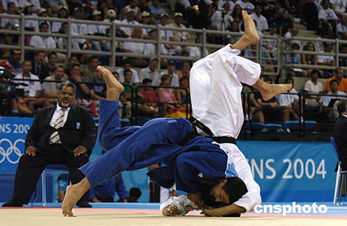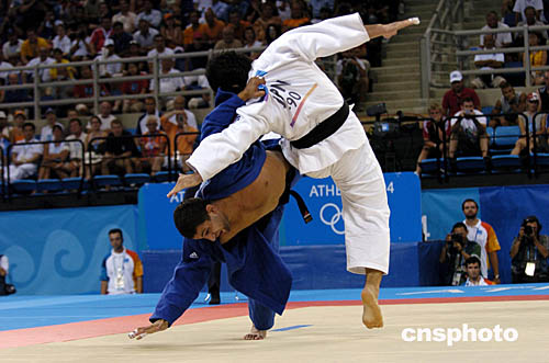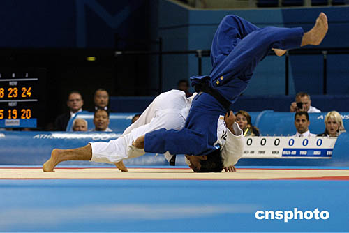 圖為在當地時間18日舉行的男子-90公斤級柔道比賽中的場面。選手們不時上演精彩的“武俠大片”。