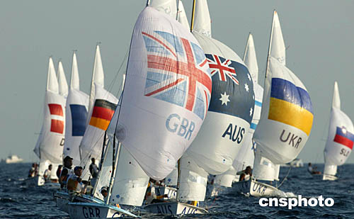 圖為在當地時間8月17日舉行的男子帆船帆板項目中,各參賽隊開局競爭激烈。