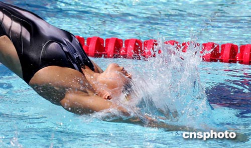 圖為當(dāng)?shù)貢r(shí)間8月19日女子兩百米仰泳比賽中德國(guó)選手Antje越入泳池的場(chǎng)景。