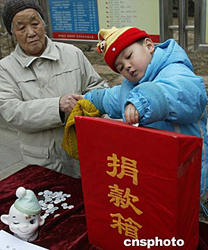 北京一名年僅三歲的幼童在奶奶的陪伴下,將積攢的硬幣一枚一枚地投入社區的捐款箱,救助印度洋地震海嘯災民。