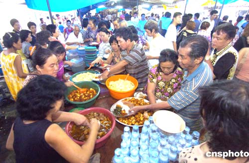 300多名入住印度尼西亞棉蘭市華族美德村收容避難的班達亞齊災民,生活甚為艱苦,災民每天均在此排隊用膳,秩序井然。作者:洪少葵