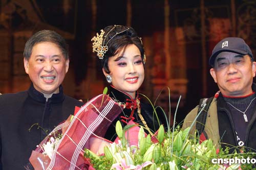 根據(jù)臺灣白先勇的作品《金大班的最后一夜》改編而成的同名大型歌舞話劇,一月六日晚在上海上演。著名演員劉曉慶領(lǐng)銜主演,該劇敘述的是上個世紀(jì)四十年代至六十年代,從上海“百樂門”到臺北“夜巴黎”的一段風(fēng)花雪月的故事,講述一位風(fēng)華絕代的舞女大班金兆麗的傳奇。圖為白先勇(左)向主演劉曉慶及導(dǎo)演熊源偉祝賀。作者:潘索菲