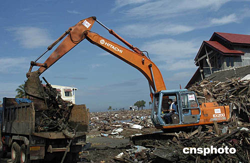 1月9日, 班達亞齊西部的洛阿村到市區,清理廢墟的工作已經加快。從洛阿村到市區的路上,一輛輛挖土機和鏟土機正在緊張地作業,將破磚破木板以及雜物鏟到運輸車上。據醫療部門人士說,災難已經過去十五日,如果不再及時清理死尸,很有可能爆發瘟疫。