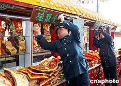 春節將至,北京東城工商分局加強對食品進行安全檢查。在檢查中一超市在北京特產“全聚德”烤鴨招牌下出售非“全聚德”烤鴨并懸掛“全聚德”招牌,對消費者造成誤導,工商執法人員將其招牌摘下。作者:羅偉