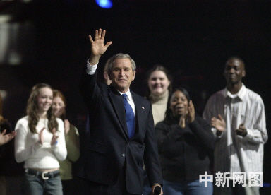 1月18日,美國總統布什出席由他的女兒在華盛頓哥倫比亞國家警備廳舉辦的青年音樂會,此活動為布什總統第二任期就職典禮的一部分。圖為布什發表演講后向大家致意。