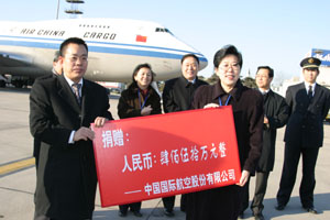 中國國航股份公司董事長李家祥在此間表示:印度洋海嘯造成的巨大災難,牽動著中國人民的心,也牽動著國航職工的心。當中國紅十字總會向國航提出運輸緊急救災物資的要求后,在運力十分緊張的情況下,中國國航取消了十九日的CA9003正常航班,將本架747-200型飛機專門用于紅十字救災物資的承運,國航為此捐出運輸費用達四百五十萬元。