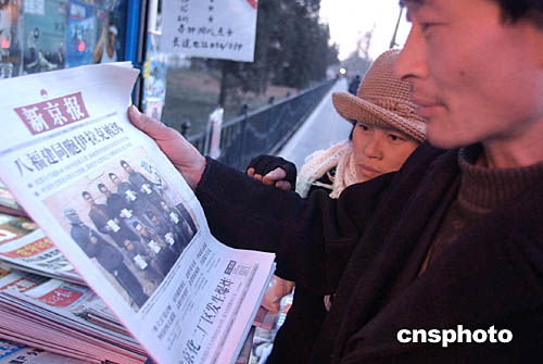 一月十九日,北京市民在書報亭前購買登載中國福建八名勞工在伊拉克遭劫持消息的報紙,詳細查看相關新聞。作者:韓藝冰