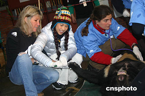 一月二十日,“拯救黑熊”愛心大使、香港藝人莫文蔚再次到訪亞洲動物基金位于成都的黑熊救護中心,正式認(rèn)養(yǎng)一頭剛被四川省林業(yè)廳解救的亞洲黑熊,并為這頭幸運的黑熊命名為“寶貝”。圖為莫文蔚(中)與亞洲動物基金創(chuàng)辦人及行政總監(jiān)謝羅便臣女士(左一)一起為這頭黑熊做身體檢查。作者:魯彥