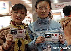 兩名北京女青年一月二十日上午來到北京國貿(mào)中心展館,在“第三屆北京國際體育基礎(chǔ)設(shè)施和場館技術(shù)展覽會(huì)”金牛直通自助售票機(jī)前,各自模擬定購了附有自己快照的2008年(8月8日20:00時(shí))北京奧運(yùn)會(huì)開幕式----國家體育館漂亮的觀眾票,模擬票價(jià)在千元以上不等。此次展會(huì)匯聚了國內(nèi)外眾多著名電子服務(wù)和場館技術(shù)企業(yè)。中新社記者:鄒憲