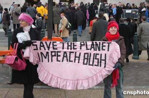 當地時間一月二十日,在美國總統布什就職典禮場外,一些示威者抗議布什當政,要求彈劾總統。作者:余東暉
