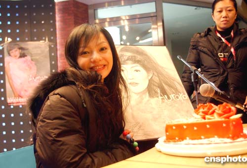 人氣急升的臺灣歌壇女新人張韶涵一月二十三日在北京舉辦歌迷見面會,簽售新專輯《歐若拉》。圖為張韶涵展示歌迷送上的慶功蛋糕和畫像。作者:韓藝冰