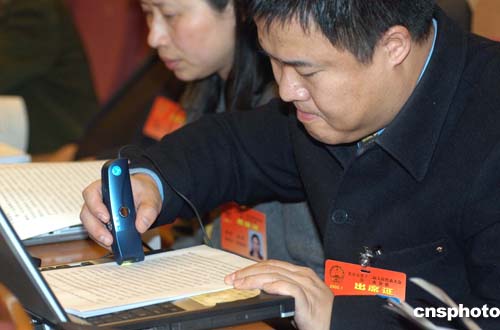 一月二十五日,北京市十二屆人大三次會議舉行第二次全體會議,有人大代表在會上用電子掃描筆將重點報告內容掃描存入電腦。作者:張宇