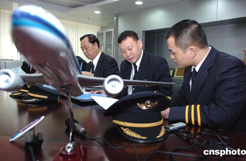 圖為南航飛行機組人員在做飛行準備工作。作者:陳文