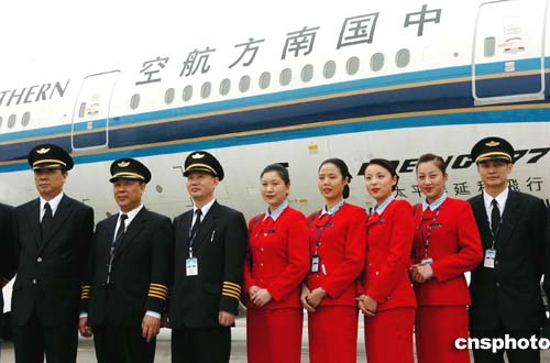 南方航空公司將執行臺商春節包機任務,擔當首航任務的南航CZ3097航班的機組人員一月二十七日亮相廣州新機場停機坪。作者:陳文
