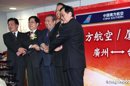 大陸首航臺北的臺商包機今天上午九時二十七分抵達臺北桃園機場。在歡迎儀式上,海峽兩岸航空業者攜手祝賀首航成功。