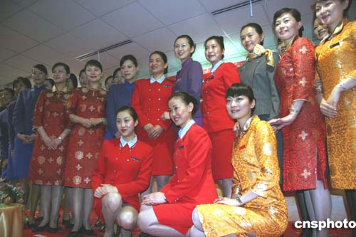 大陸首航臺北的臺商春節包機今天上午九時二十七分抵達臺北。圖為臺灣華航、復興航空為大陸南航、廈航舉辦的歡迎儀式上,兩岸空中小姐相聚合影。作者:邢利宇