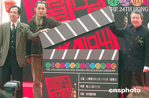 《第二十四屆香港電影金像獎頒獎典禮》2月1日在香港星光大道舉行候選名單公布記者會,香港電影金像獎協會主席文雟(右)、電視廣播有限公司助理總監何麗全(左)、香港電臺二臺節目總監周國豐(中)一同主持拍板,寓意本屆香港電影金像獎頒獎典禮正式揭開序幕。作者:鄧慶樂