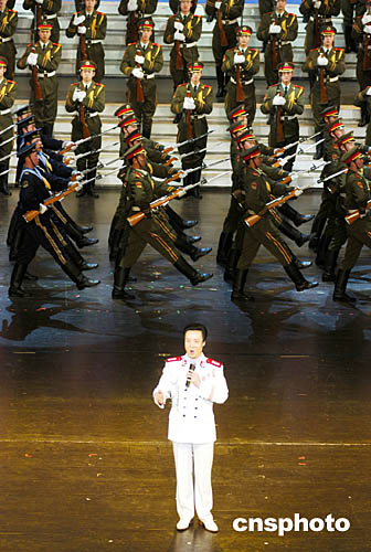 眾多解放軍文藝工作者歷時三個月創作的2005年軍民迎新春文藝晚會,二日晚在北京中國劇院隆重與廣大軍民見面。圖為解放軍總政治部歌舞團歌唱演員閻維文與中國人民解放軍儀仗大隊官兵,表演男聲獨唱與軍體操《軍旗下的我們》。中新社記者:王麗南